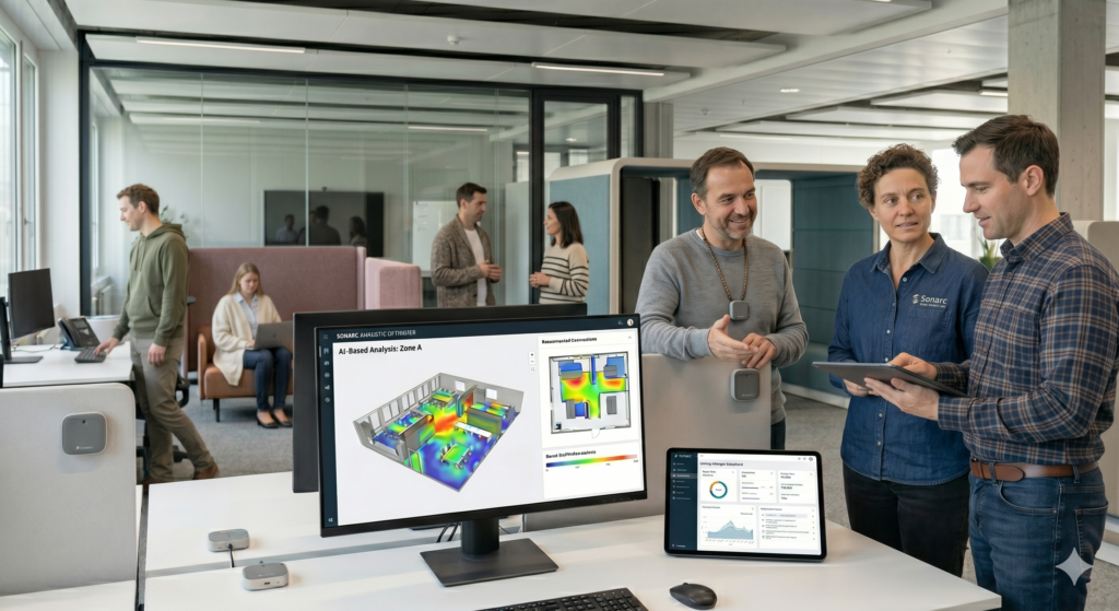 Das Produkt besteht aus drei Komponenten. Erstens die Hardware: kompakte Mikrofon-Sensoren, die im Raum verteilt werden und über einen definierten Zeitraum die Raumakustik aufzeichnen, darunter Nachhallzeit, Störgeräuschpegel und Sprachverständlichkeit. Zweitens die Software als Cloud-Plattform: Die KI analysiert die erfassten Akustikdaten, erstellt eine 3D-Raumsimulation und generiert konkrete Massnahmenvorschläge wie die Positionierung von Schallabsorbern, die Konfiguration von Sound-Masking-Systemen sowie Empfehlungen für Raumtrennungen und Materialien. Drittens eine digitale Dienstleistung: laufendes Akustik-Monitoring mit Dashboard für Facility-Manager, automatisierte Reports und Benchmarking mit vergleichbaren Räumen.